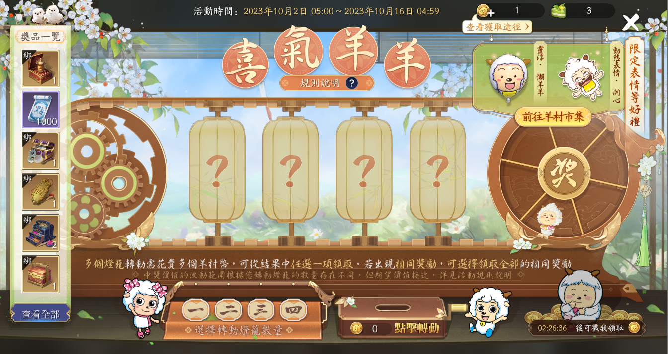 在活動期間內,少俠們可通過羊村幣來進行抽獎。消耗羊村幣即可轉動燈籠,選擇轉動 1 個燈籠,可直接獲得獎勵結果;若轉動多個燈籠,則可以在轉出的獎勵結果中任選其一;若獎勵結果存在 2 個(含)以上相同的獎勵,則可選擇全部拿走該相同的獎勵。喜歡豪賭的少俠可嘗試多個羊村幣一起上,可以增加稀缺物品的獲取機率唷!