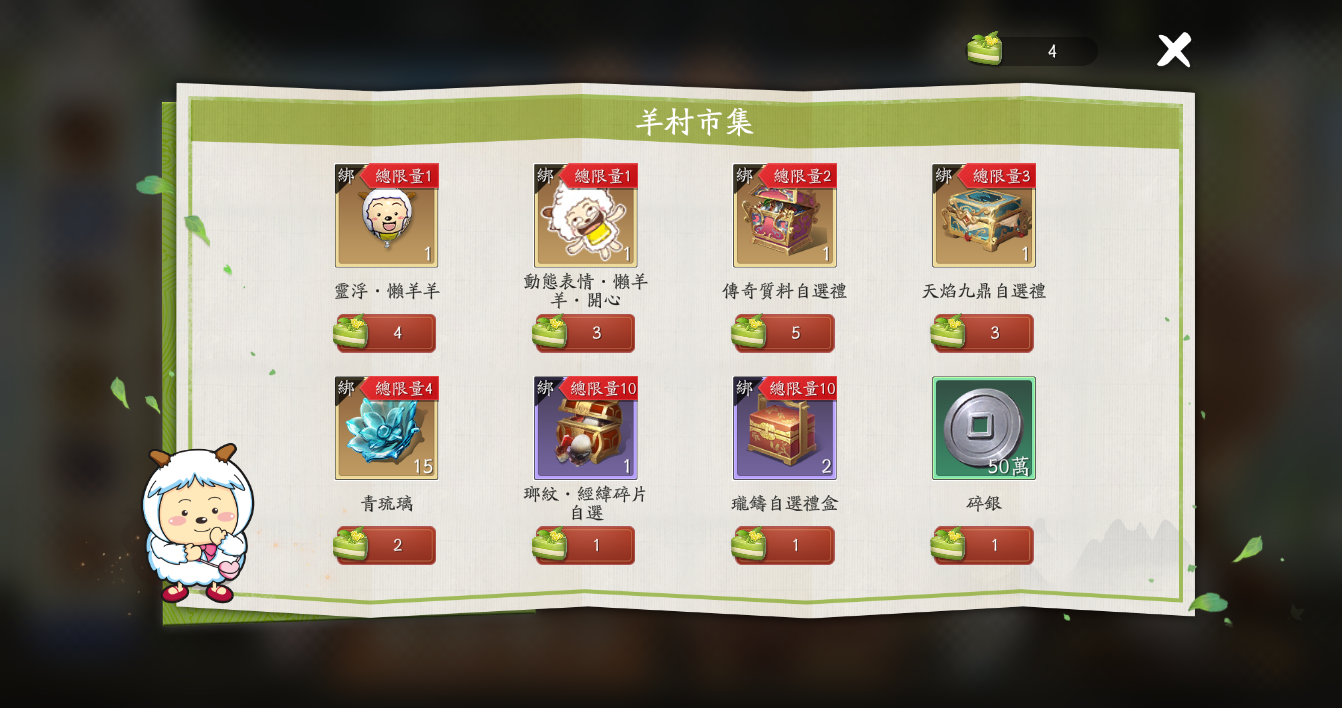 在使用羊村幣轉動燈籠後,就會獲得相同數量的青草蛋糕,拿著青草蛋糕可以去羊村市集換取各類道具,有飾品【靈浮‧懶羊羊】及動態表情【懶羊羊·開心】等可愛裝扮可以兌換!